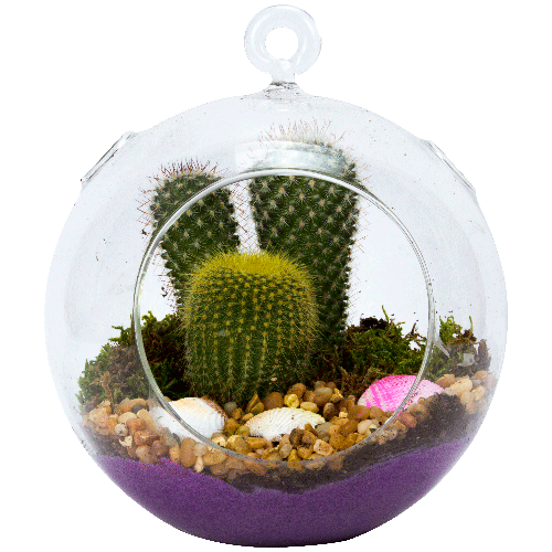 Comes with one 6" glass globe plant terrarium, succulent plants, moss, rocks, sand, and seashells.